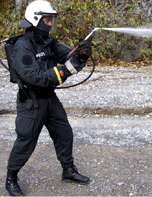 Features - Easily rechargable • Specially designed fire extinguisher Police P 3.5 for use by police forces. Quick & safe knock down of fires such as pyrotechnic devices within 2 to 4 seconds. • Compact and wieldy • Refillable by police forces during demonstrations within 120 seconds (no tools required) • Permanent compatibility with fire-fighting units on the ground due to well-selected accessories and components • Extinguishes Class A and Hydrocarbon Class B fires • Instant cooling effect in fire-fighting operation • No possible re-ignition of area extinguished • Flame-retardant harness for backpack type use • Burn wounds will be free from powder contaminations • One handed operation • Ready for reuse at low cost due to water plus additive • Less than €1 in refilling costs • 15 seconds operating time • Used by European Police & Special Forces |